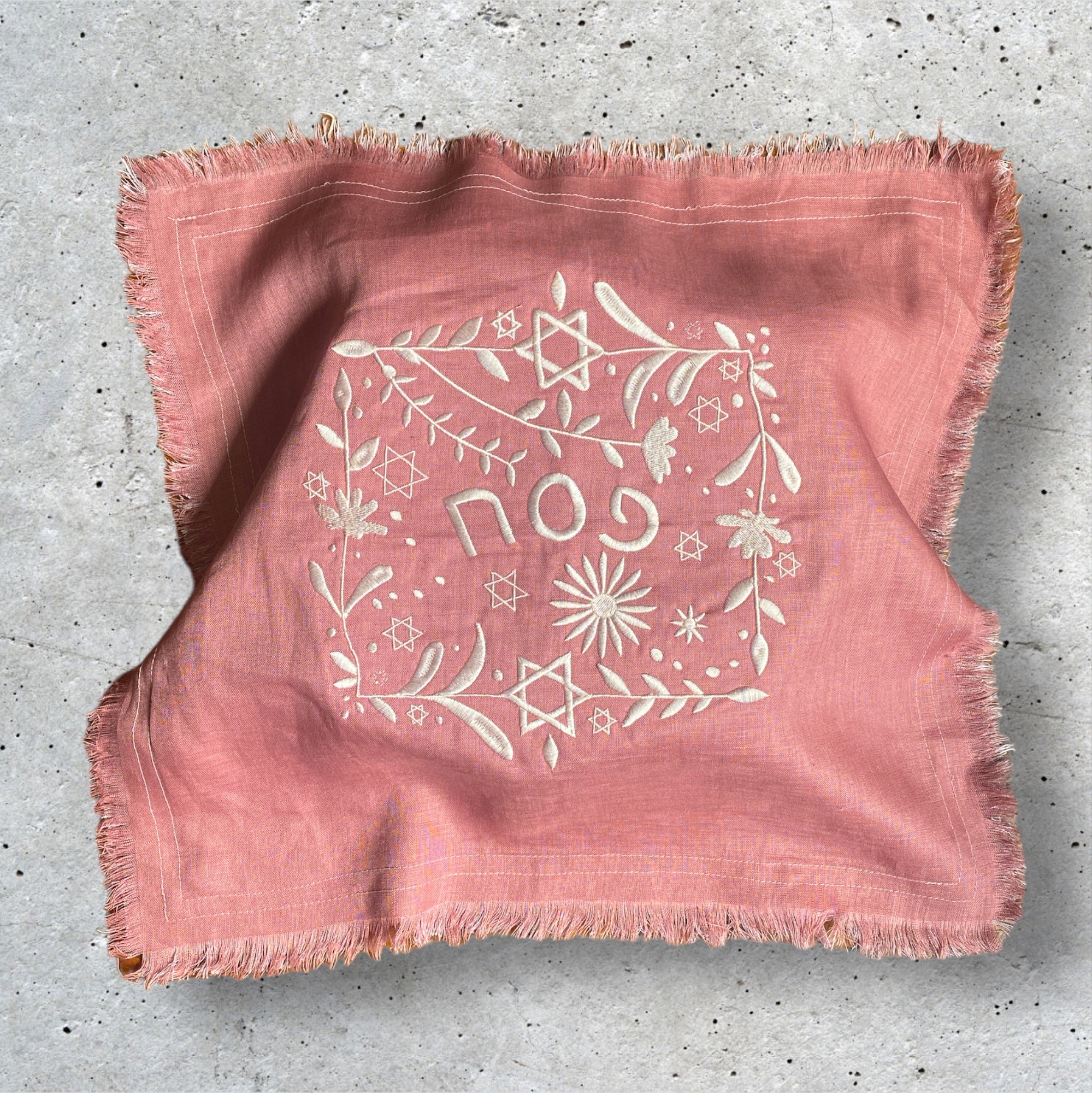 These beautiful handmade matzah covers are perfect for Pesach! Complete your Seder table with a linen embroidered matzah cover. Embroidery reads 'Pesach' in Hebrew. This is a 3 pocket bag with the reverse in the same coloured linen.